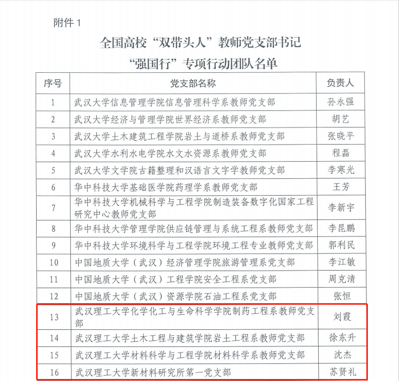 近日,教育部办公厅和湖北省委教育工委分别公布了全国和全省高校“双带头人”教师党支部书记“强国行”专项行动团队名单,鸭王制药工程系教师党支部入选全国高校“双带头人”教师党支部书记“强国行”专项行动团队。