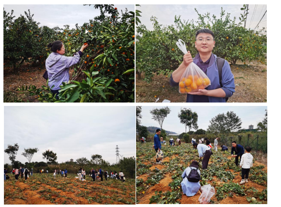 午餐结束后,教职工来到桔子红农庄,进行摘桔子和挖红薯体验活动,感受劳动的乐趣。现场人头攒动,欢声笑语不断。教职工手拿工具,穿梭于果园或菜地之间,相互帮助、分享、品尝,享受大自然的馈赠。