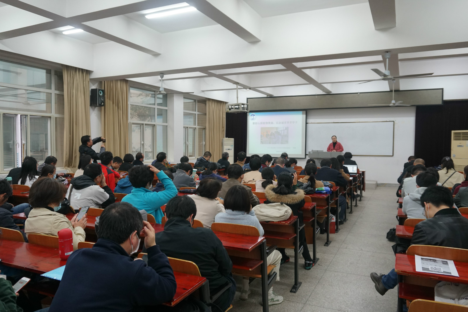 312会议室举办师德讲坛活动,邀请学校师德标兵、鸭王