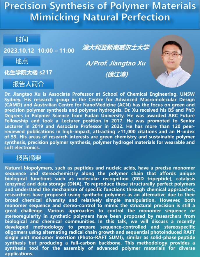 【鸭王 ·学术报告】Precision Synthesis of Polymer Materials Mimicking Natural Perfection